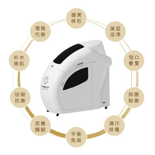 采用纳米粉碎技术将纯净水打碎,释放出比水雾粒子更细小的“纳米雾”,同时释放高浓度负氧离子。在纳米负氧离子舱内纳米雾和高浓度的负氧离子均匀覆盖全身肌肤,它们从呼吸系统(占18%)和皮肤(占82%)进入血液及淋巴系统,运送至全身,促进细胞代谢、活化肌肤、促进血循环、改善微循环;低温排毒、杀菌;消除积存自由基、延缓衰老;提高免疫力、激活自愈能力;有效舒缓神经压力、改善睡眠,帮助产后康复;进而达到养颜美肌、焕发青春活力等效果。